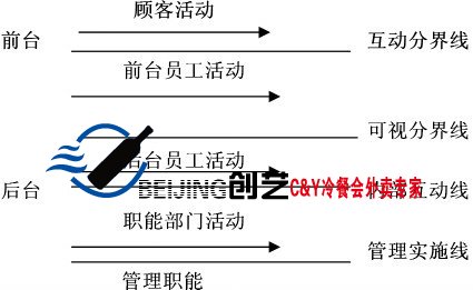 在冷餐会瓶颈分析中,存在着“一次”瓶颈和“二次”瓶颈,可以利用服务业务流程分析图来描述以及分析各个流程步骤指定的必要能力,这种方法是十分有效和重要的。在所有的服务瓶颈当中,较难消除的是动态瓶颈。因为他们没有具体原因而且在不停流动的过程中,从而在不同时间、地点会产生不同现象,这对管理人员提出了更高的要求,要求更详细的调研。较易消除的是静态瓶颈,因为在这种瓶颈现象旁边工作任务会大量堆积,通过能力却很小,并且产生原因清晰。如果服务人员能通过分析顾客特殊需求,并将此需求反馈到服务提供流程中,而后再设计一个适合该顾客的流程线路,那么他所提供的服务将是顾客满意度最高、服务时间最少、效率最高的服务。笔者通过对所在城市冷餐会厅调查研究后发现,大部分自助餐厅都面临一个问题———提高工作效率以适应每小时 120 名顾客的压力,而目前的情况是只能增加一名员工。当前的服务流程是按照一条服务线设计的,顾客要通过服务系统部仅仅是一个“工程”,它还是一种结构,是一种以简洁明确的方式将服务理念和设计思路转化为服务传递系统的图示方法。在自助餐服务过程中,服务蓝图包括组织结构、信息系统结构、设施环境结构、财务系统结构等。服务蓝图用水平和垂直两个方向的设计将“流程”、“结构”和“顾客”联系起来,包括四个部分的内容:(1)顾客活动;(2)支持过程;(3)前台员工活动;(4)后台员工活动。服务蓝图的结构式由垂直方向上的设计表示出来,从上而下体现冷餐会服务系统的组成,即前台服务接触、后台支持性工作管理活动。结构层次刚好是传统组织结构的倒置, 一线员工在上, 管理者在下。“可视线”相对于顾客将服务前台与后台分开,“互动分界线”将员工行为和一线服务人员的行为相联系,“管理实施线”将管理职能活动和业务活动区分开来,“内部互动线”则将服务系统的后台与组织内的其他支持性功能部门分开。因此,通过对服务蓝图的解读,管理者可以从顾客角度了解服务的基本路线和过程,了解服务系统的构成和前后台的相互关系,从而预见服务瓶颈。